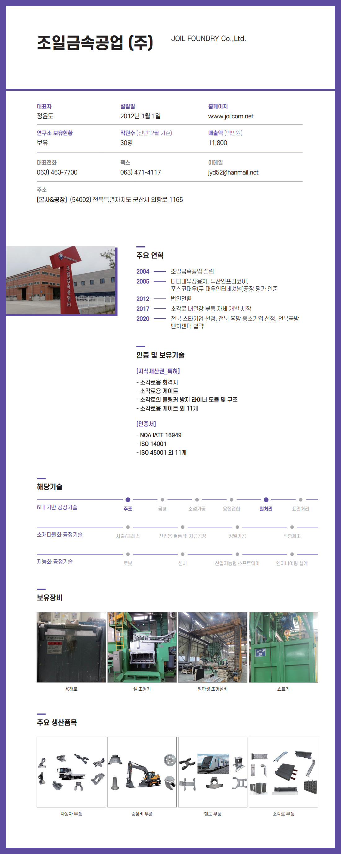 주물/주조 조일금속공업(주) 대표자 정윤도 전화번호 063-463-7700 팩스번호 063-471-4117 이메일 jyd52@hanmail.net 소재지 군산시 주생산품 자동차부품, 중장비부품 홈페이지 http://www.joilcom.net 목록