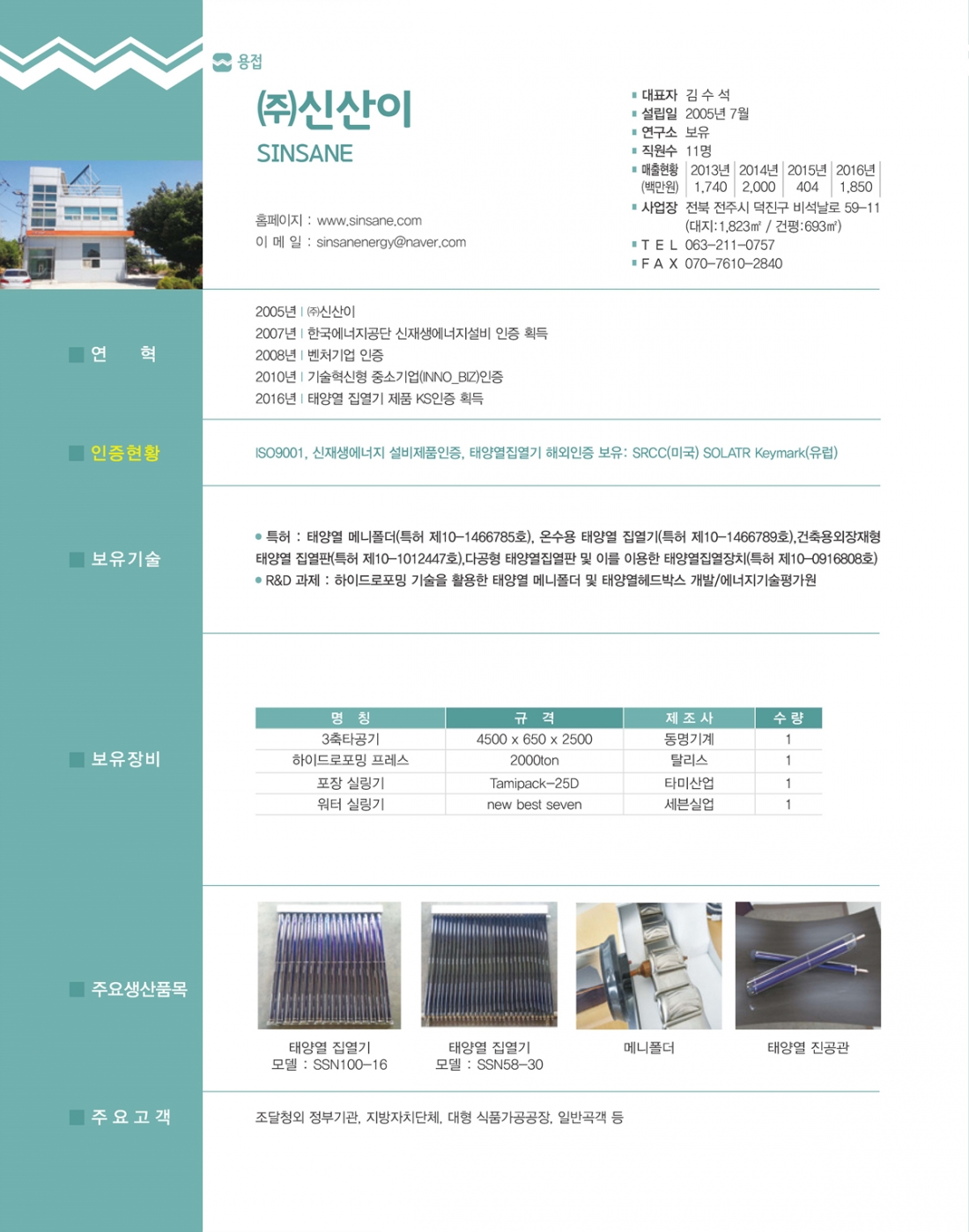 용접 ㈜신산이 대표자 김수석 전화번호 063-211-0757 팩스번호 063-211-0049 이메일 sinsanenergy@naver.com 소재지 전주시 주생산품 태양열 집열기 제조 및 설치 홈페이지 http://www.sinsane.com 목록