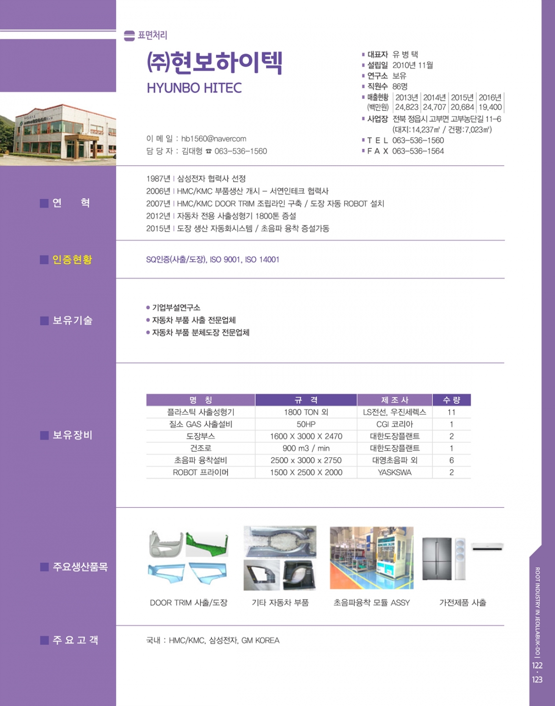 표면처리 현보하이텍 대표자 송상우 전화번호 063-536-1563 팩스번호 063-536-1564 이메일 hb1560@naver.com 소재지 정읍시 주생산품 자동차 부품 도장 목록