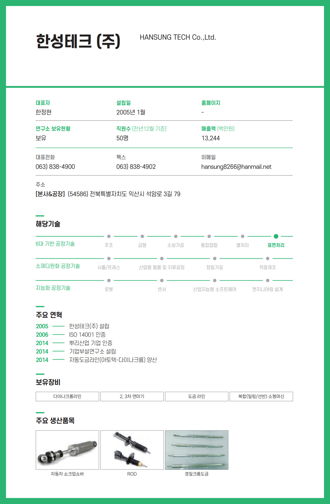 표면처리 한성테크㈜ 대표자 한정현 전화번호 063-838-4900 팩스번호 063-838-4902 이메일 hansung8266@hanmail.net 소재지 익산시 주생산품 쇼크업쇼바 ROD 목록