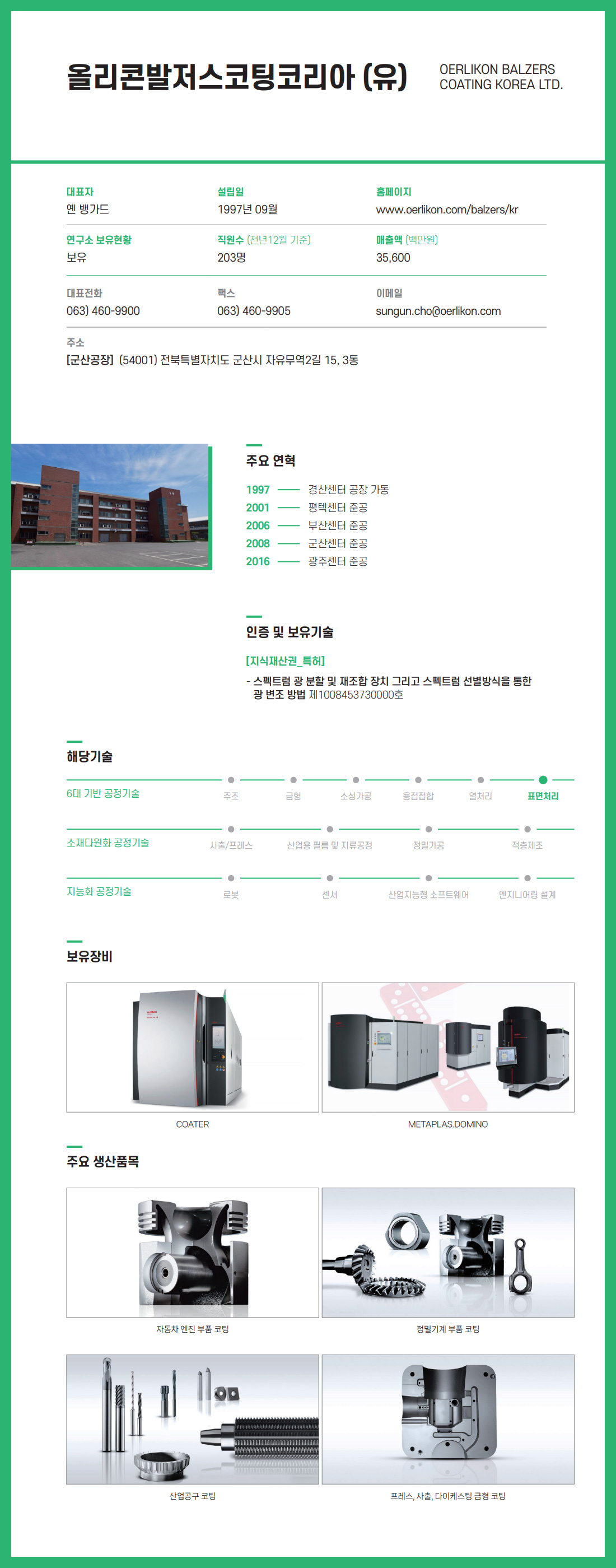 표면처리 올리콘발저스코팅코리아 (유) 대표자 옌 뱅가드 전화번호 063-460-9900 팩스번호 063-460-9905 이메일 sungun.cho@oerlikon.com 소재지 군산시 주생산품 저마찰 및 내마모 PVD 코팅 홈페이지 https://www.oerlikon.com/balzers/kr 목록